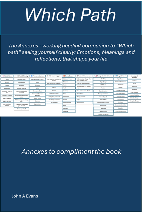 The Annexes provide a hands-on bridge between reflection and action. Drawn from the deeper framework of Which Path, they bring together tools, metaphors, and coaching exercises that guide you to explore beliefs, behaviours, and emotional patterns with curiosity and care. Whether used alongside the book or on their own, the annexes help you translate insight into forward movement — one practical step at a time. This is where understanding meets structure: a companion resource for anyone ready to turn awareness into a new way of thinking, being, and choosing.